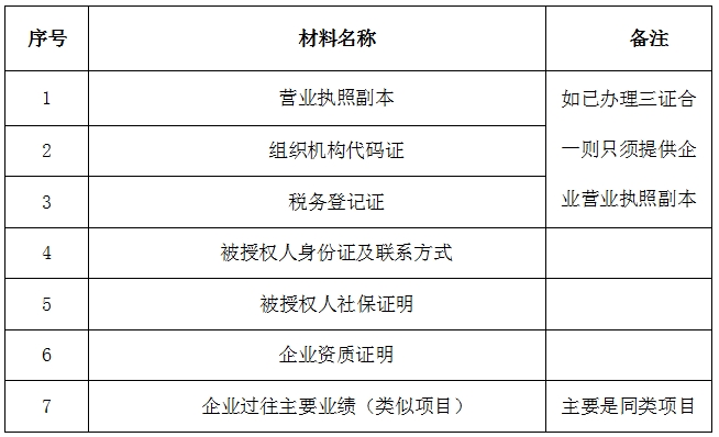 2、 凡有意向參加投標者,請在上述期間內按下表提供報名資料,相關證明文件的原件如無法提供原件則提供復印件加蓋公司公章,投標人須將上述資料的掃描件發郵件至招標聯系人處進行報名。