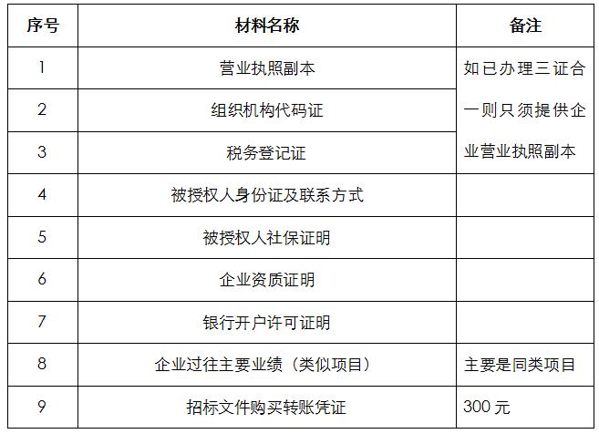 2、 凡有意向參加投標者,請在上述期間內按下表提供報名資料,相關證明文件的原件如無法提供原件則提供復印件加蓋公司公章,投標人須將上述資料的掃描件發郵件至招標聯系人處進行報名。