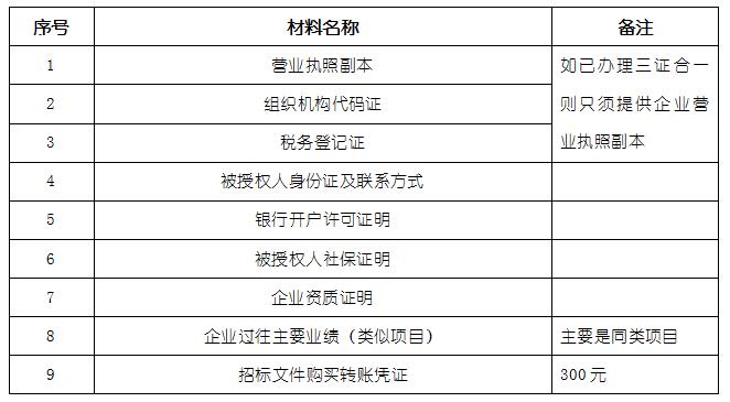 2、 凡有意向參加投標者,請在上述期間內按下表提供報名資料,相關證明文件的原件如無法提供原件則提供復印件加蓋公司公章,投標人須將上述資料的掃描件發郵件至招標聯系人處進行報名。