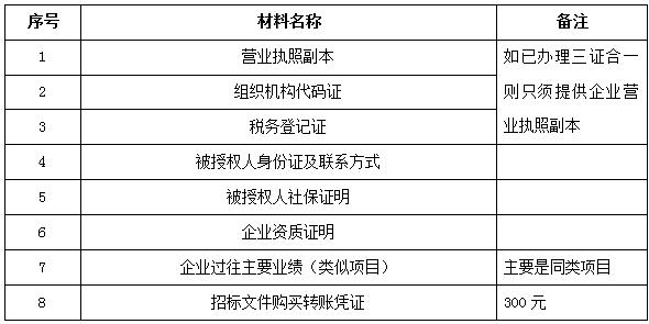 2、 凡有意向參加投標者,請在上述期間內按下表提供報名資料,相關證明文件的原件如無法提供原件則提供復印件加蓋公司公章,投標人須將上述資料的掃描件發郵件至招標聯系人處進行報名。