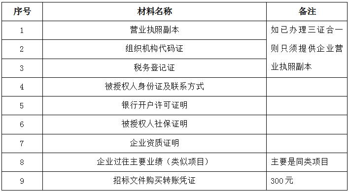 2、 凡有意向參加投標者,請在上述期間內(nèi)按下表提供報名資料,相關證明文件的原件如無法提供原件則提供復印件加蓋公司公章,投標人須將上述資料的掃描件發(fā)郵件至招標聯(lián)系人處進行報名。