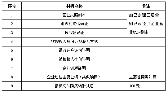 2、 凡有意向參加投標者,請在上述期間內按下表提供報名資料,相關證明文件的原件如無法提供原件則提供復印件加蓋公司公章,投標人須將上述資料的掃描件發郵件至招標聯系人處進行報名。