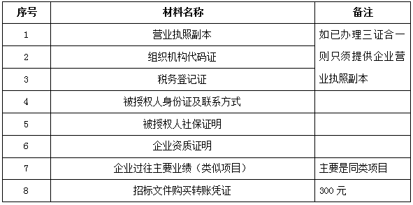 2、 凡有意向參加投標(biāo)者,請(qǐng)?jiān)谏鲜銎陂g內(nèi)按下表提供報(bào)名資料,相關(guān)證明文件的原件如無法提供原件則提供復(fù)印件加蓋公司公章,投標(biāo)人須將上述資料的掃描件發(fā)郵件至招標(biāo)聯(lián)系人處進(jìn)行報(bào)名。