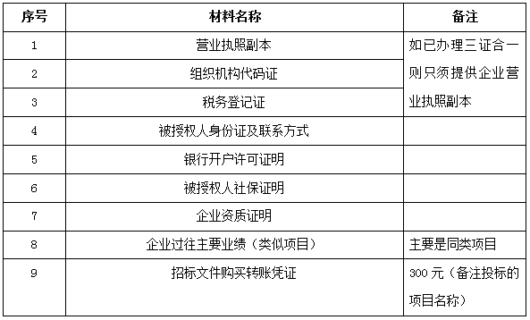 2、 凡有意向參加投標者,請在上述期間內按下表提供報名資料,相關證明文件的原件如無法提供原件則提供復印件加蓋公司公章,投標人須將上述資料的掃描件發郵件至招標聯系人處進行報名。