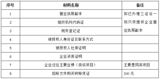 2、 凡有意向參加投標者,請在上述期間內按下表提供報名資料,相關證明文件的原件如無法提供原件則提供復印件加蓋公司公章,投標人須將上述資料的掃描件發郵件至招標聯系人處進行報名。