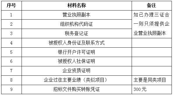2、 凡有意向參加投標者,請在上述期間內(nèi)按下表提供報名資料,相關(guān)證明文件的原件如無法提供原件則提供復(fù)印件加蓋公司公章,投標人須將上述資料的掃描件發(fā)郵件至招標聯(lián)系人處進行報名。