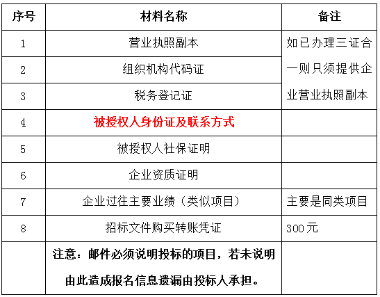 2、 凡有意向參加投標者,請在上述期間內按下表提供報名資料,相關證明文件的原件如無法提供原件則提供復印件加蓋公司公章,投標人須將上述資料的掃描件發郵件至招標聯系人處進行報名。
