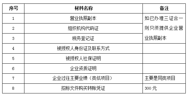 2、 凡有意向參加投標者,請在上述期間內(nèi)按下表提供報名資料,相關證明文件的原件如無法提供原件則提供復印件加蓋公司公章,投標人須將上述資料的掃描件發(fā)郵件至招標聯(lián)系人處進行報名。