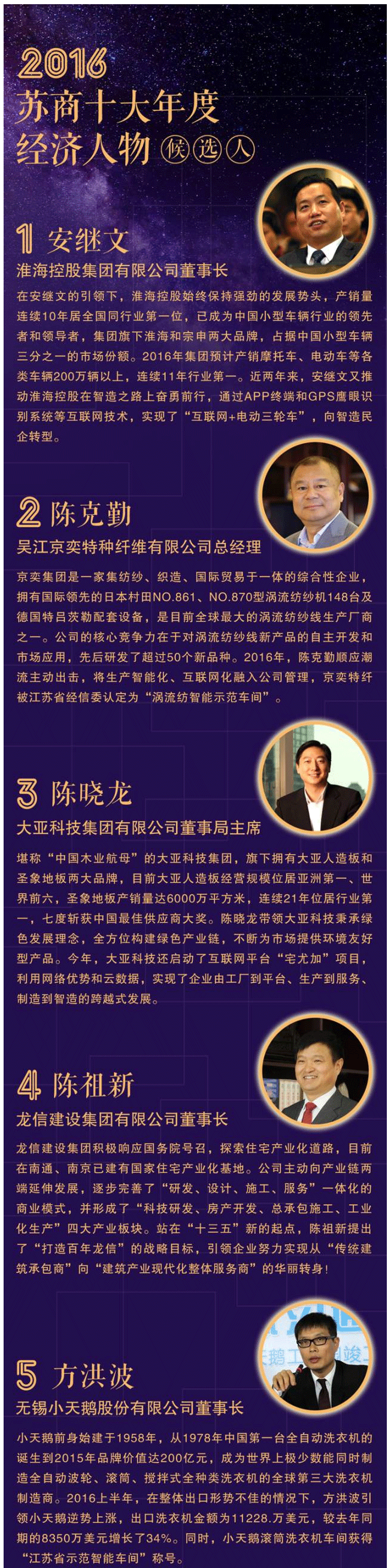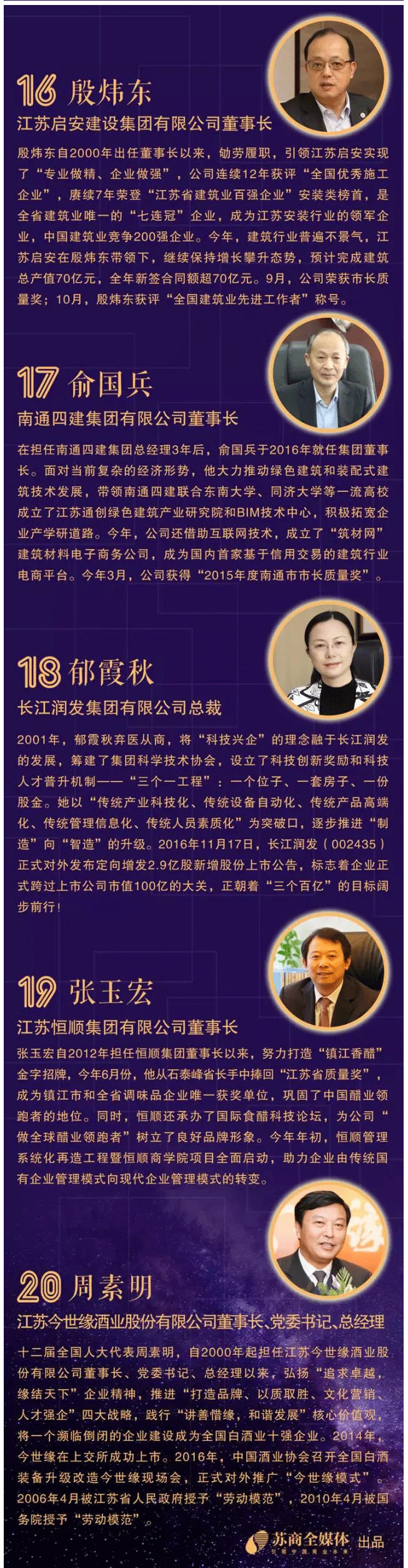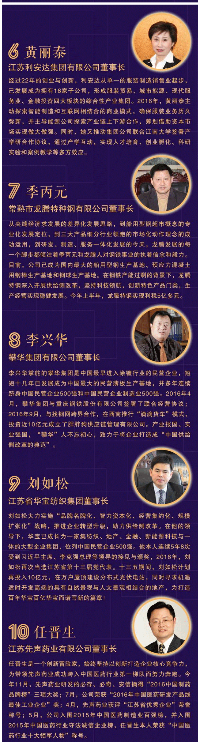 “2017第11屆蘇商領袖年會”即將在南京盛大舉行。屆時,“2016蘇商十大年度經濟人物”將重磅登場,從社會關注、業界影響、商業變革、社會責任感等多角度彰顯江蘇企業家的獨特魅力。