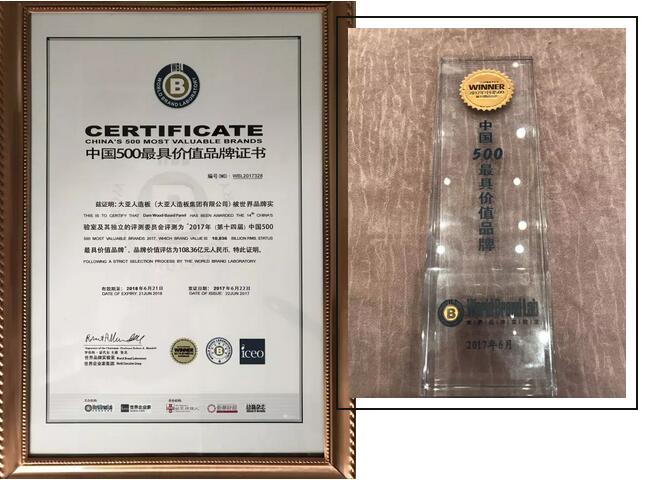 6月22日,由國際權(quán)威品牌評審機(jī)構(gòu)——世界品牌實(shí)驗(yàn)室(World Brand Lab)主辦的“世界品牌大會”暨“2017年(第十四屆)中國500最具價(jià)值品牌”發(fā)布會在北京舉行,會上發(fā)布了2017 年“中國500 最具價(jià)值品牌”排行榜。在這份基于財(cái)務(wù)數(shù)據(jù)、品牌強(qiáng)度和消費(fèi)者行為分析的年度報(bào)告中,大亞人造板以108.36億元人民幣的品牌價(jià)值榮登人造板行業(yè)榜首!
