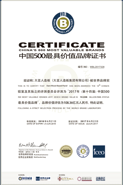 大亞人造板榮膺“中國十大纖維板品牌”、“中國十大刨花板品牌”、“中國板材行業(yè)最具影響力(品牌)制造企業(yè)”、“中國林業(yè)產(chǎn)業(yè)誠信企業(yè)品牌”及“中國品牌年度大獎NO.1”(人造板行業(yè))、“2017年中國500最具價值品牌”等殊榮,并以108.36億元人民幣的品牌價值榮登人造板行業(yè)榜首,“大亞®”商標(biāo)為中國馳名商標(biāo)。無論從生產(chǎn)工藝、產(chǎn)品品質(zhì)或是客戶服務(wù)、綠色環(huán)保等方面來說,大亞人造板都走在了行業(yè)的最前端。