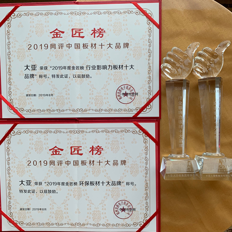 在9月2日晚舉行的中國木業(yè)網(wǎng)2019中國板材“金匠榜”網(wǎng)絡評選活動頒獎典禮上,大亞人造板又榮獲“行業(yè)影響力板材十大品牌”及“環(huán)保板材十大品牌”兩項殊榮,這是對大亞人造板的行業(yè)影響力和堅持綠色環(huán)保理念的肯定。