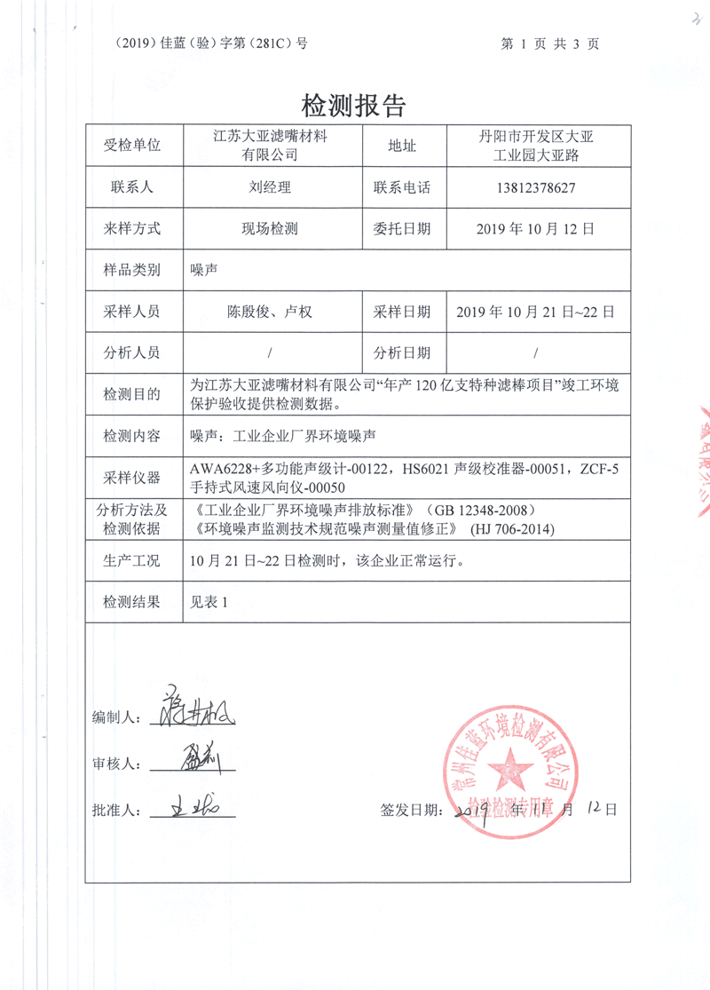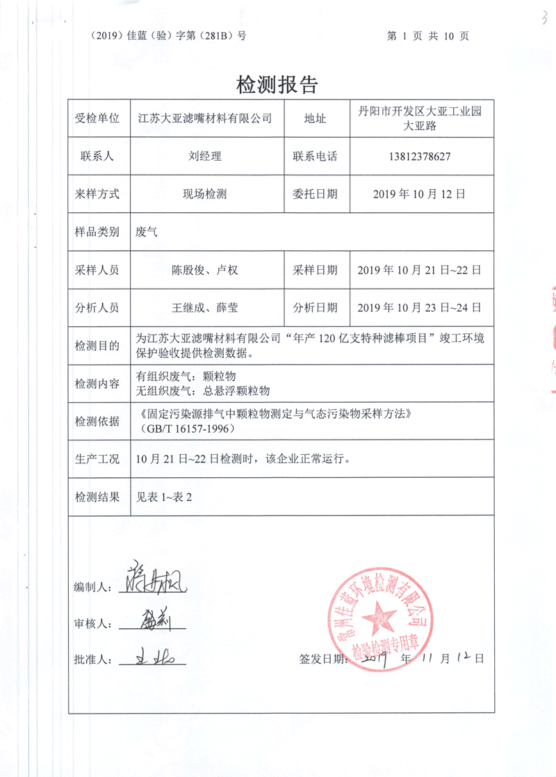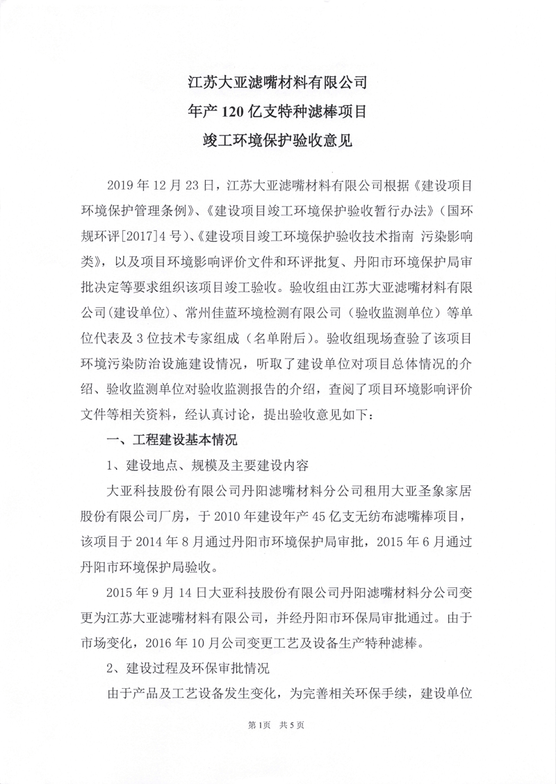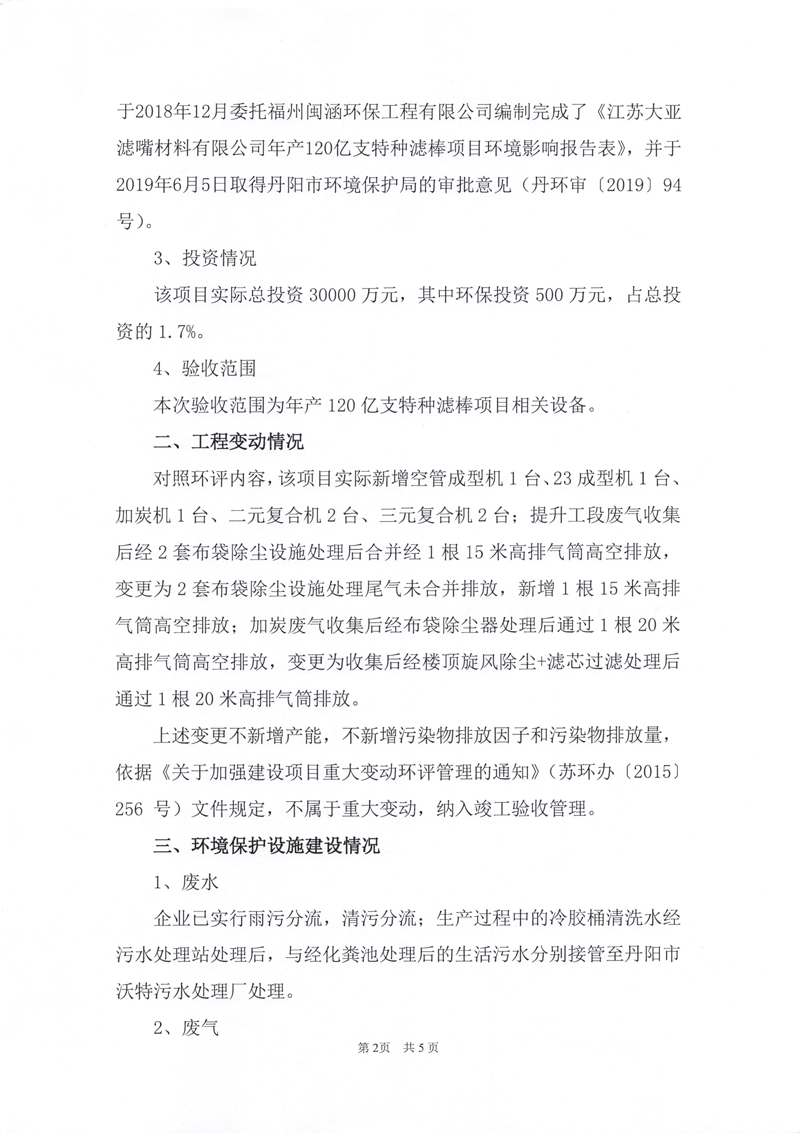 江蘇大亞濾嘴材料有限公司年產(chǎn)120億支特種濾棒項目環(huán)境保護驗收監(jiān)測情況自主公示