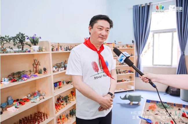 △董事長在圣象捐贈的“開心教室”接受媒體采訪,圣象本次除了捐贈兒童用品之外更是為孩子們搭建了“開心教室”(由整裝設計+事業部以及商用空間事業部提供整體空間設計以及安裝施工)以及修繕操場等,為孩子們提供一個綠色的人居生活空間,并特為孩子們辦了一個61游園會。